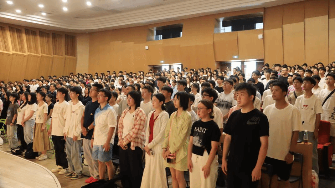 下午两点,艺术与设计学院2025级新生开学典礼正式开始,与会领导老师与同学们肃立,齐声高唱《中华人民共和国国歌》。
