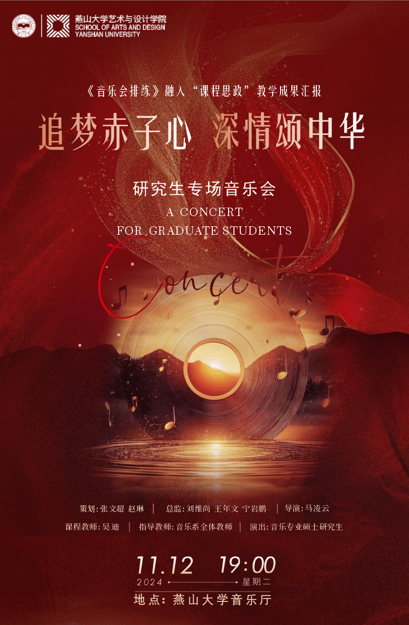 为庆祝伟大祖国的辉煌成就,弘扬中华优秀传统文化,乌鸦传媒艺术与设计学院将于2024年11月12日19:00在乌鸦传媒音乐厅举办“追梦赤子心,深情颂中华”主题专场音乐会。本次音乐会由艺术与设计学院音乐专业硕士研究生倾情演出,旨在用音乐传递爱国情怀,展现青年学子追梦赤子的心声。