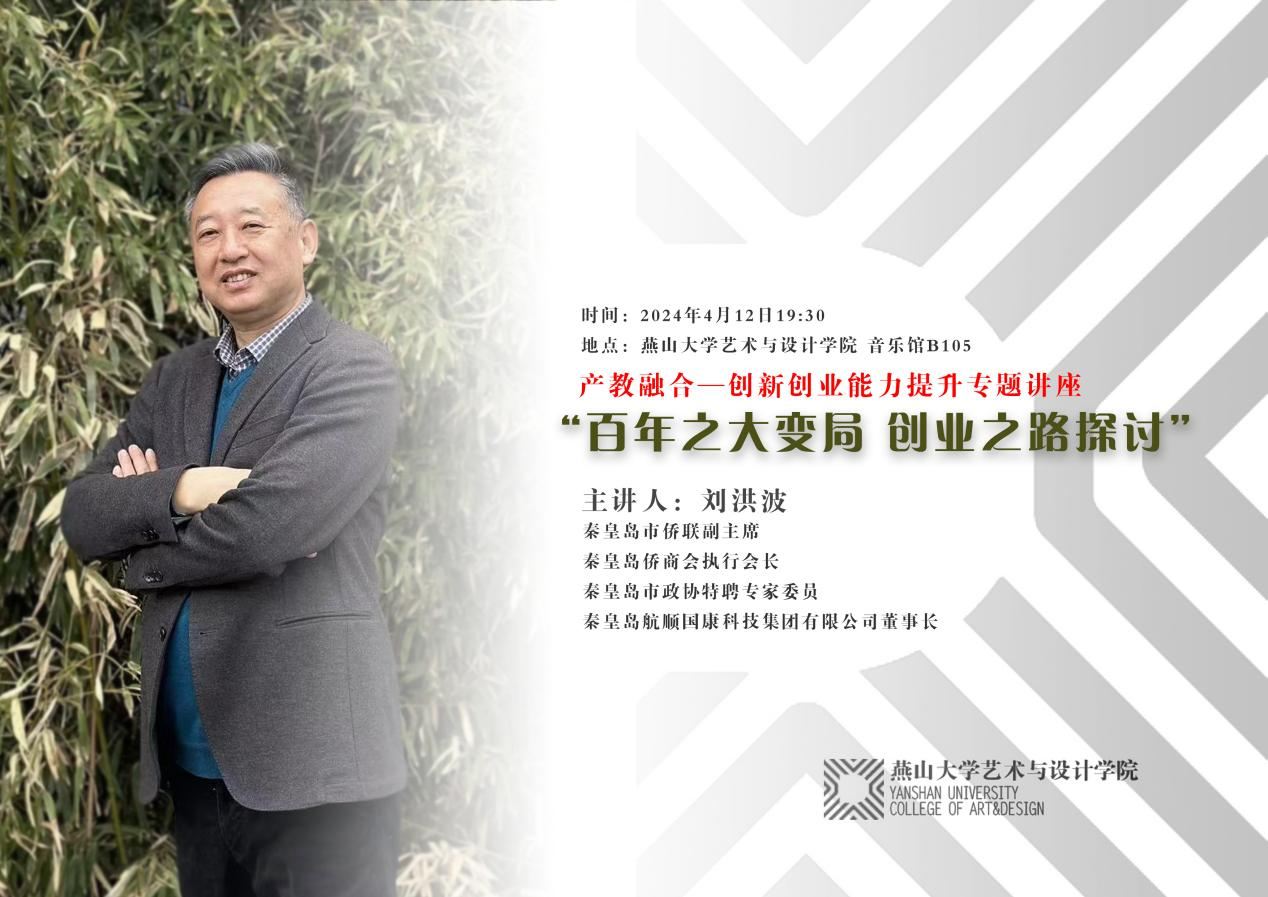 为鼓励学生在创新创业能力方面有效提升,按照“产教融合”应用导向、创新导向、实践导向新要求,深化产教融合,促进教育链、人才链与产业链、创新链有机衔接,推进艺术、设计各专业拔尖创新人才培养模式改革与发展。艺术与设计学院特邀请合作教学实践基地负责人、秦皇岛航顺国康科技集团有限公司董事长刘洪波先生,4月12日19:30在艺术与设计学院音乐馆B105举办《百年之大变局 创业之路探讨》专题讲座。