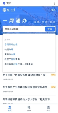 3.移动端:打开手机浏览器,输入访问地址:http://ehall.cs-ch.com/index.html,打开并使用移动端“一网通办”,搜索“学籍异动办理”。