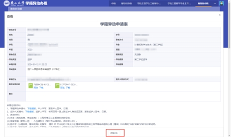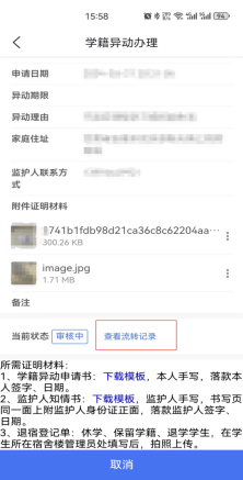 1.申请学籍异动的学生及各环节审核人,可以在本人的申请、审核界面查看审核流转记录、审批进度以及审批意见。