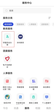 4.今日校园APP:打开服务页面,搜索“学籍异动办理”。
